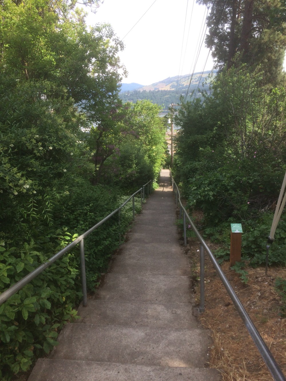 Tofu was more interested in the red rhode in the park across the street. The May street house is two blocks from a staircase that goes from the heights to downtown Hood River.