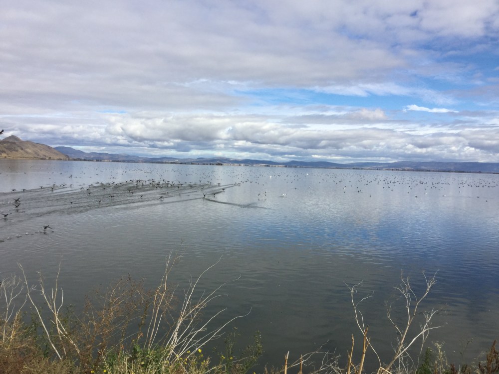 First there was yesterday. Rising early from a night in a noisy tent (the highway noise was relentless), Tofu and I headed South to Tule Lake. There’s a wildlife refuge on the way to the Lava Beds National monument. It’s a huge lake and it was covered in birds.