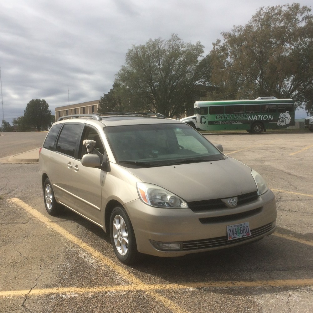 Continuing east, the flat countryside became a little more rolling. Grass was making an appearance. As we entered Clarendon, there was a college on a hill next to the highway that had lots of grass. I decided it was time for Tofu to have her postponed morning walk. We usually walk a mile or two every morning before Tofu’s breakfast. But those nasty goat heads have been everywhere we have been. So I’ve been looking for grassy parks (which are not too plentiful). So we visited Clarendon College.