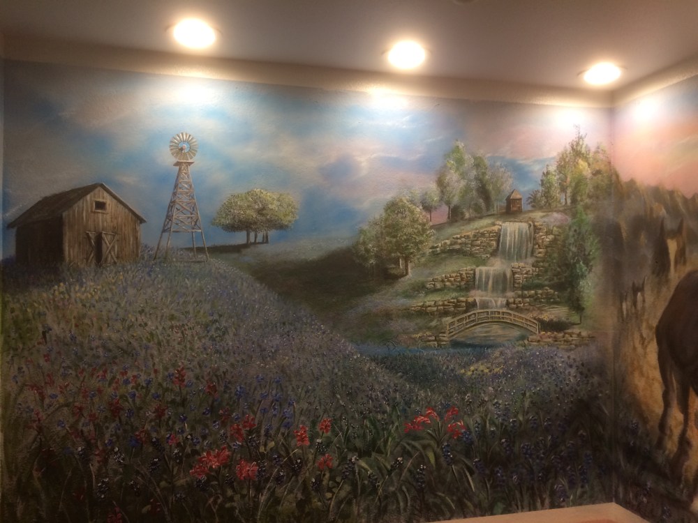 Arriving in Wichita Falls there was really only one thing I wanted to see… Wichita Falls. The guy at Motel 6 told me to go down the freeway to the Visitor Center. He said they would know where the Falls were. So I did go to the Visitor’s center. It was a nice building. There were 6 employees standing in a prayer circle, praying that someone would come in the door so they could keep their jobs. One of them saw me come in, and the others stopped praying long enough to marvel at my arrival. I presented them with my request: where are the Falls. They seemed a little embarrassed, “Oh, they’re just down the road a bit, but I think they’re turned off. Because of the rain.” “Say what?”. I was escorted to a mural.
