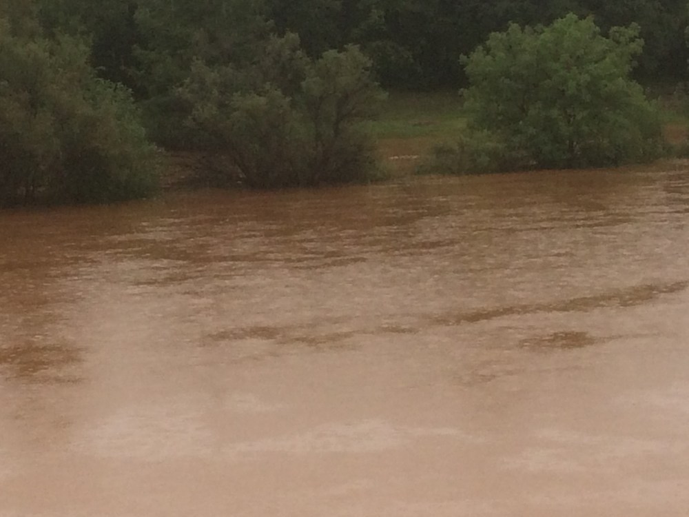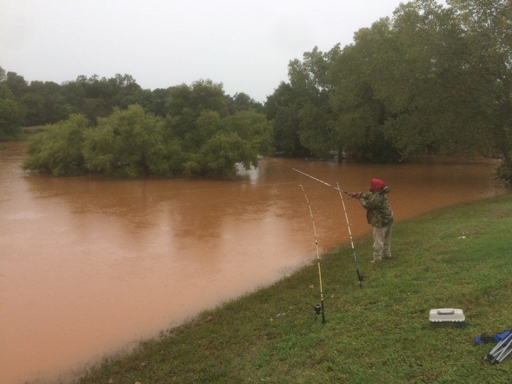Because of all the rain the Wichita River has flooded. Note the man who has three fishing poles in the water: cat fishing.