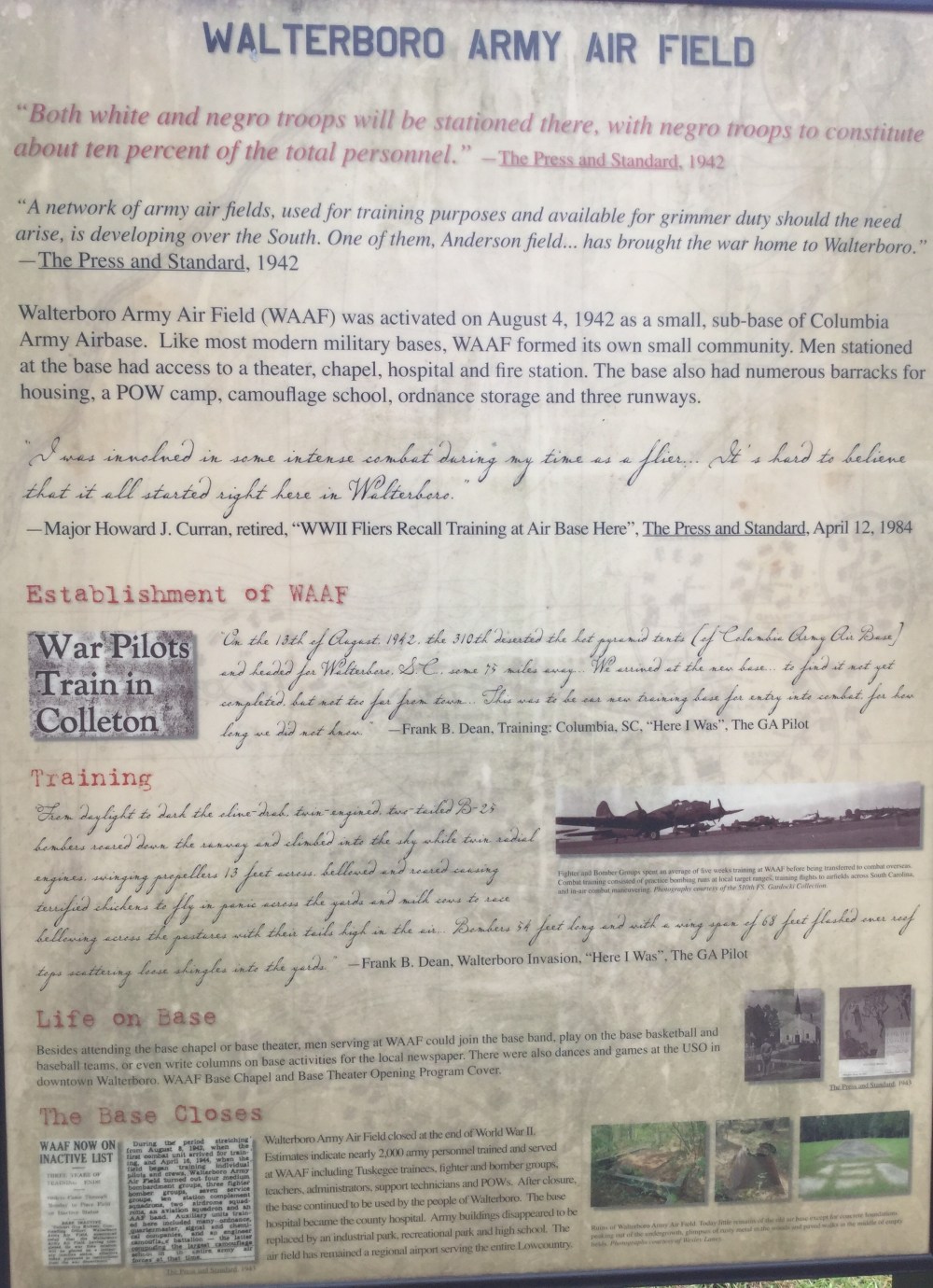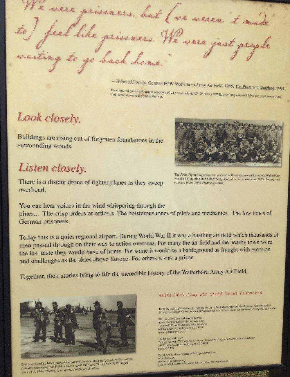 This morning we rose early and hit the country roads, headed for Walterboro, South, Carolina. No particular reason, But as I got to to own there was a sign directing me to the Tuskegee Airmen National Monument. As per usual, the signage directing us to the Monument was atrocious. Luckily, I am smart enough to figure out the Monument would be close the airport. This is where I found a really Underwhelming. Still there was some good information.