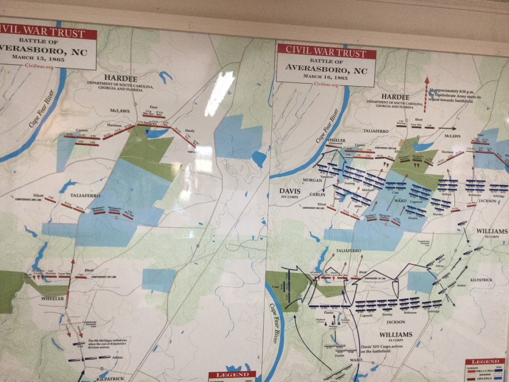 The other two flags are the Confederate South Carolina flag and the Confederate Battle Flag. At the time of this battle, March 15,16, 1865, Union General Sherman had made his March through the South and was heading north to join General Grant. The Confederates were told to block their path for 24 hours. So the Confederates were north of the Union army, trying to keep them south. Terrible fighting took place on these grounds. The Confederates were successful in holding back the Union troops At night hey sneaked away. T was raining hard through the engagement, which took place very close to the Cape Fear River.